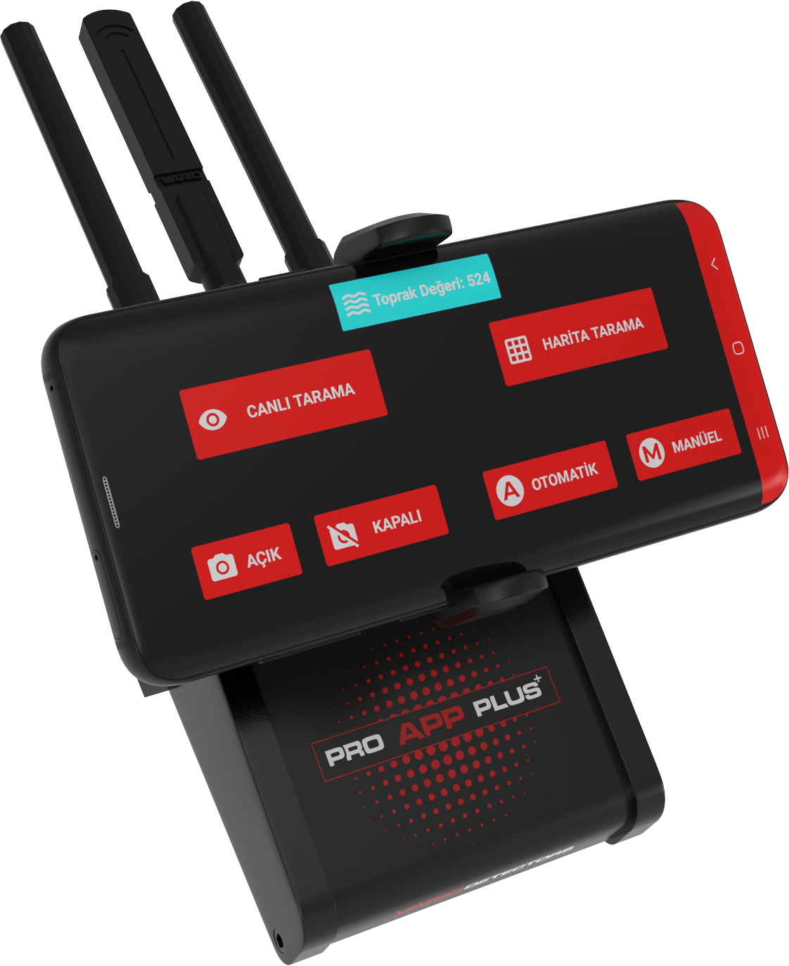 Mobil uygulama yardımı ile telefonunuzun 5 Milyar hertzlik gücünü kullanan dünyada ilk ve tek alan tarama & yer altı görüntüleme cihazı Pro App Plus+ uzun mesafeleri tarama ve yüksek derinliklerde sağlıklı veriler almanızı sağlıyor.